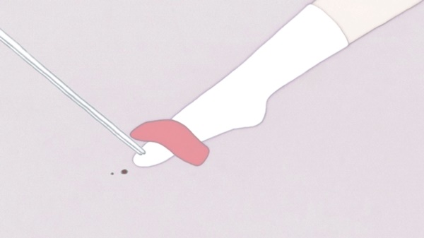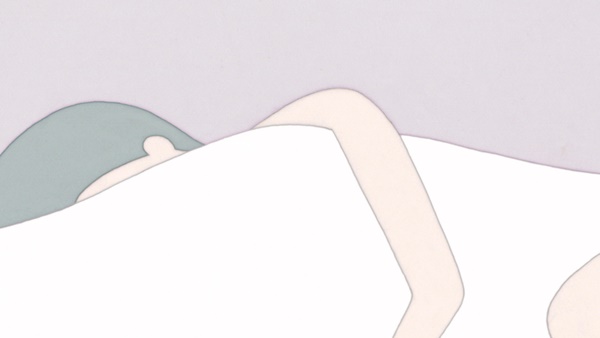 젊은 여자가 이불 속에서 육체적 정신적으로 자신을 잃어간다.